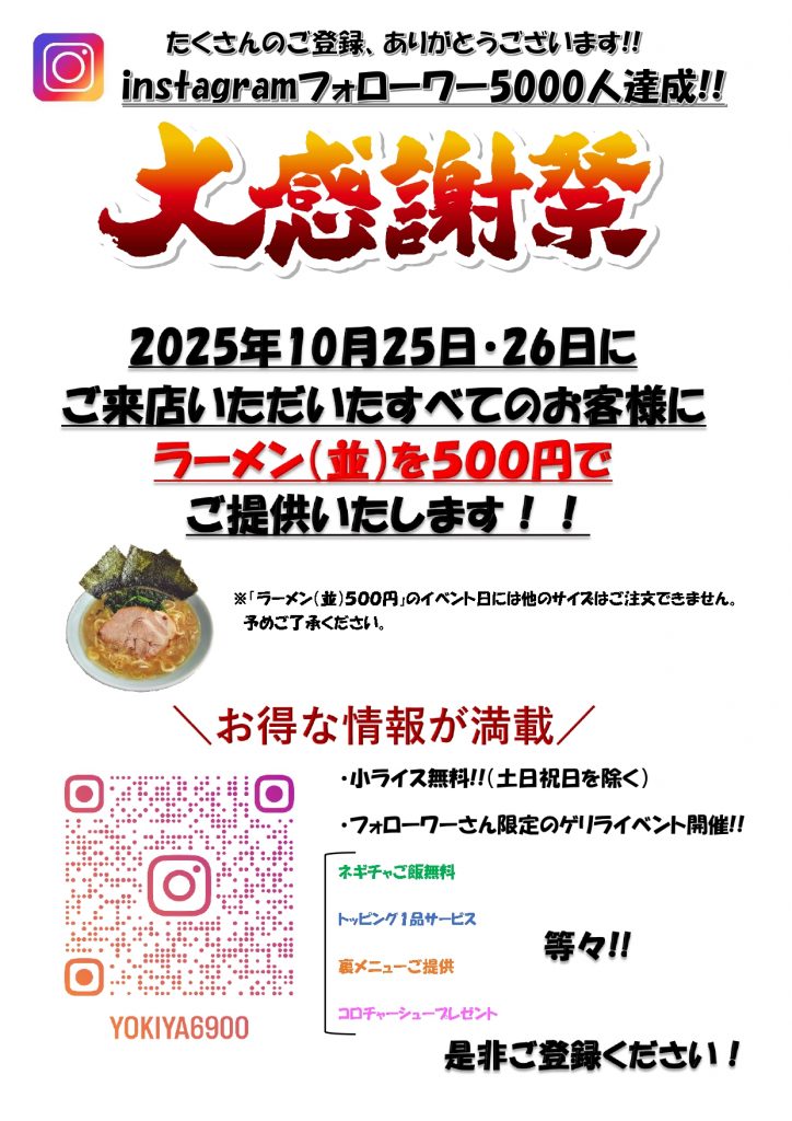インスタ5000人感謝祭!! 2025年10月9日 いつもお越しいただきありがとうございます! 皆様のおかげでインスタのフォローワーが5000人まで増えました!ありがとうございます(T_T) 感謝を込めて前回ご好評いただきました「ラーメン(並)500円」イベントを開催いたします!! この機会に是非お越しください!!! 期間:10月25日・10月26日 イベント内容:お越しいただきましたすべてのお客様にラーメン並を500円でご提供!!